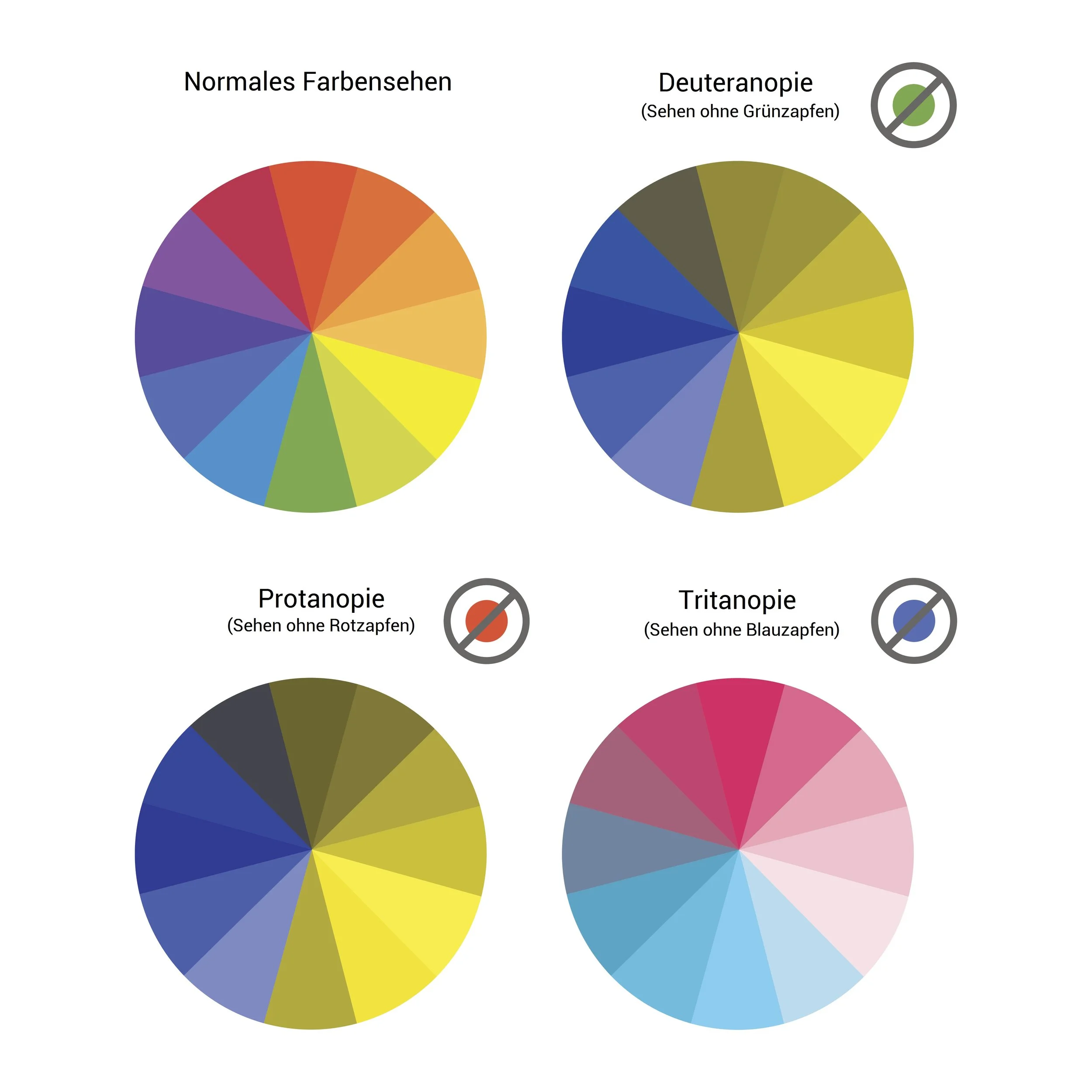 Das Auge besitzt drei verschiedene Rezeptoren („Zapfen“) für das Farbensehen. Sie nehmen entweder rotes, grünes oder blaues Licht wahr. Ist die Funktion einer dieser Zapfenarten fehlerhaft, so werden Farben anders wahrgenommen. Die Wahrnehmung bei einer Störung der Rot- oder Grünrezeptoren ist dabei nahezu identisch, da diese Farben komplementär sind. Ganze 99% der Farbsehstörungen sind Deuter- oder Protanopie, also sogenannte Rot-/Grünschwächen.